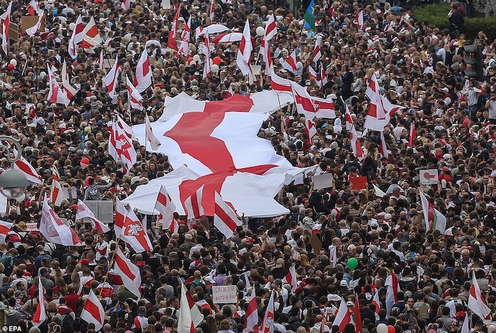 デモ隊が掲げているのはベラルーシ人民共和国時代の国旗(1918〜19年)。第一次世界大戦中、ドイツ軍によって占領されていた当時、ブレスト=リトフスク条約によって独立が宣言され、赤軍が首都ミンスクに侵攻するまでの短期間存続した”国家”です。同国が、民族自決を謳歌した束の間の”春”であっただけに、今でも理想的な国家形態としてベラルーシ国民の心を摑んでいます。