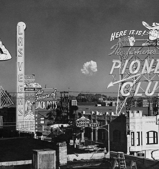 原爆投下が太平洋戦争を早期終結させたといった官製プロパガンダが功を奏し、米ソ間の核開発競争が激化する中、核兵器はパクス・アメリカーナ (Pax Americana) の男性的シンボルとして米国民には好意的に受け止められていました。こうした類い希なる”キラー・コンテンツ”を、ギャンブル以外のエンターテイメントを模索していた魔都ラスベガスのビジネス・セクターが見逃すはずもありません。