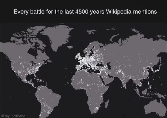 こちらの地図は、多言語インターネット百科事典ウィキペディアに記述された過去4,500年にわたる人類の「戦闘行為」を点で示したものです。ややもすれば我々現代人は、戦争などといった野蛮な行為は、人権意識に乏しい”後進国”で起こるものだと思い勝ちです。しかしながらこの地図を見れば、そうした考えこそが傲慢の極みであることがわかります。