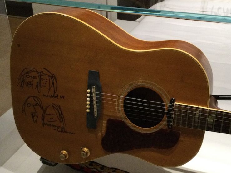 俗に〈Bed-In guitar〉と称されるギブソンJ160-Eアコースティック・ギター。2度のベッド・インに持参したギターの表面にはふたりの自画像が描かれています。
