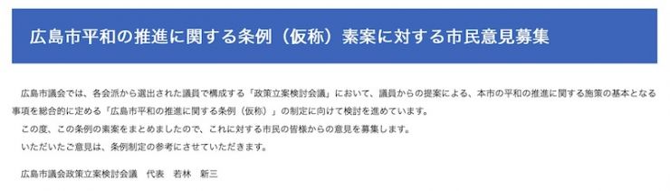 個人的には、昭和24年に制定された『広島平和記念都市建設法』で示された平和哲学を踏襲した意義深い内容であると大いに評価しています。折しも核兵器禁止条約が発効されたばかりといった絶妙なタイミングでもあり、広島市がその立ち位置を改めて確認するといった意味においても重要な条例となるでしょう。是非とも広島市民の皆様には、積極的にパブリック・オピニオンを提出し、「政策立案検討会議」の試みをサポートすると同時に、独自のプランをどしどし提案して頂きたい(提出期間は今月15日まで。詳細は下記の市公式サイトをご覧下さい)。