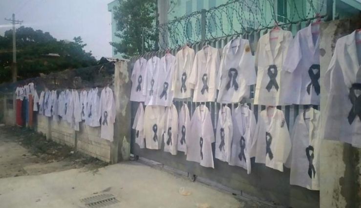 医療従事者たちは、抵抗を意味する黒いリボンが描かれた制服を吊って抗議の意を表しています。